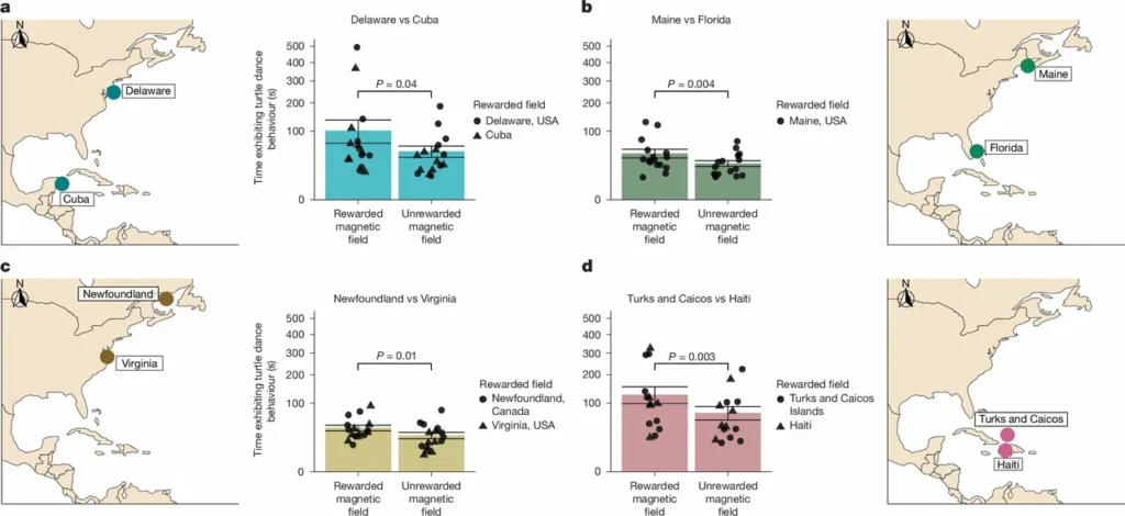 Затем исследователи меняли конфигурацию магнитного поля и переставали кормить рептилий. И на голодный желудок плясать им почему-то уже не хотелось. Для проверки через 4 месяца подопытных животных снова поместили в магнитное поле, в котором их кормили. В этот раз еду не насыпали, но логгерхеды вспомнили сытые времена и снова начали кружиться в воде.